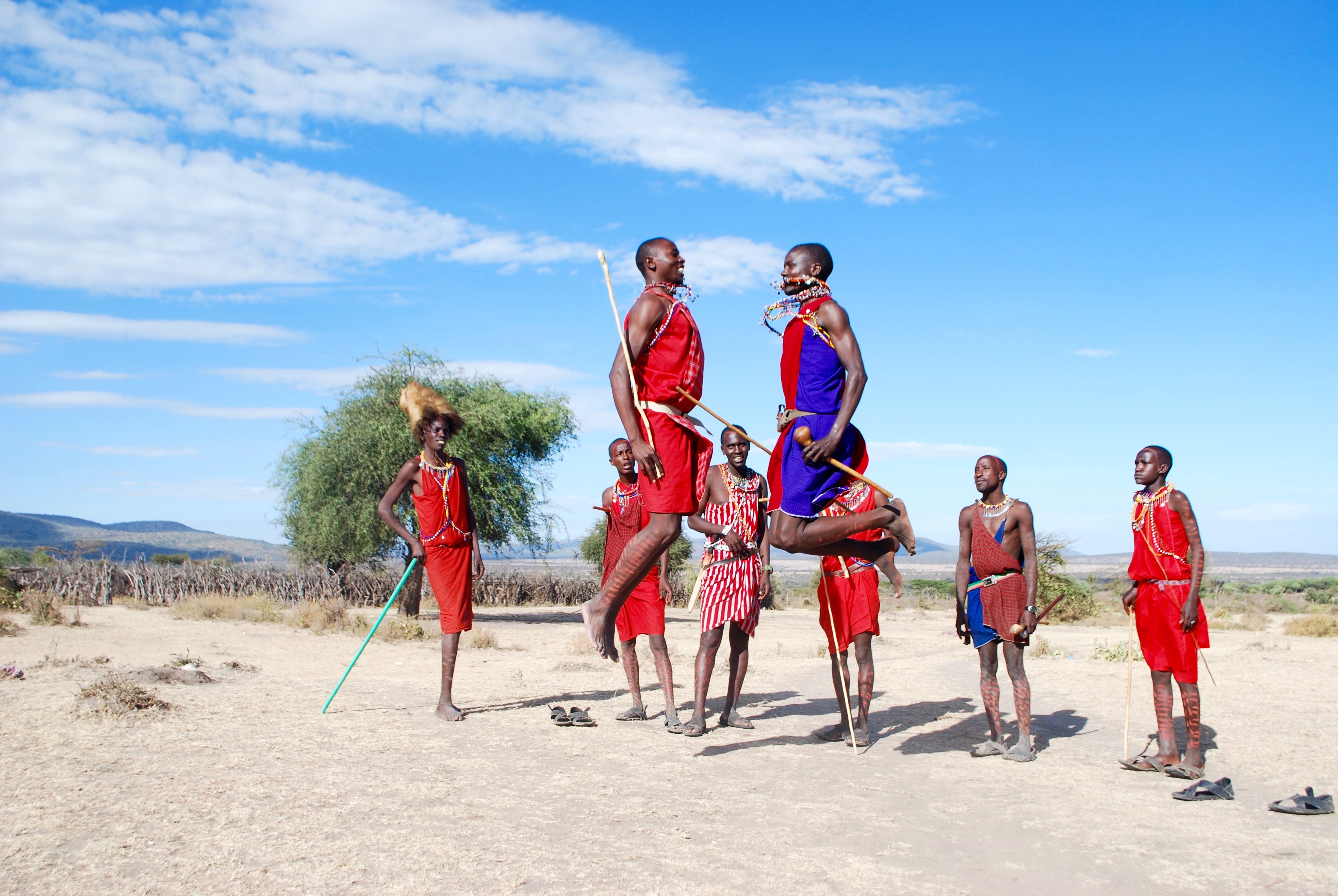 Masai men jumping as high as they can, an ancient tradition meant to attract the ladies.